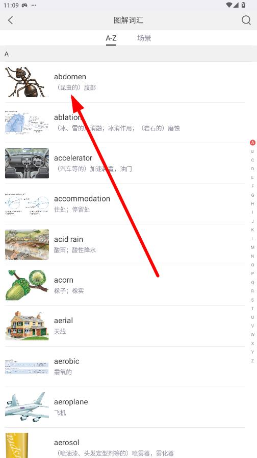 3、在彈出的圖解詞匯列表中,選擇想要查看的詞匯類(lèi)別,比如點(diǎn)擊abdomen。