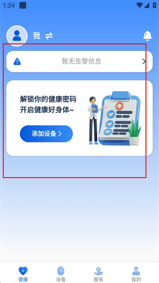 4、完成信息完善后,進(jìn)入個(gè)人中心界面,可查看告警信息、添加健康設(shè)備。