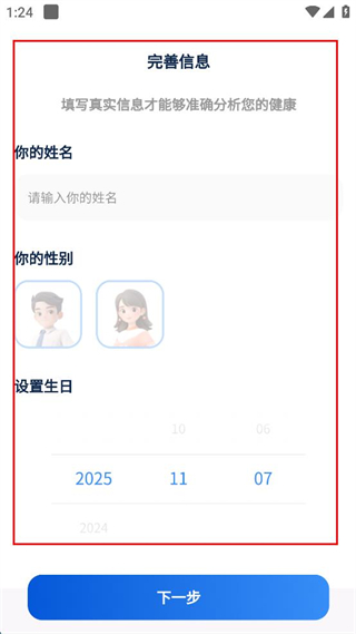 3、注冊(cè)后進(jìn)入完善信息界面,填寫姓名、選擇性別、設(shè)置生日,點(diǎn)擊“下一步”。