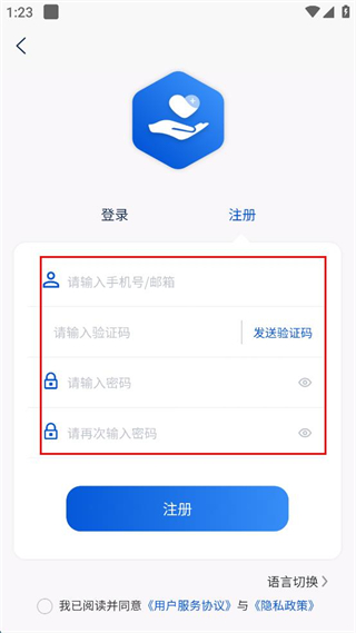 2、在注冊(cè)界面,輸入手機(jī)號(hào)/郵箱、驗(yàn)證碼、密碼并再次輸入密碼,完成注冊(cè)操作。