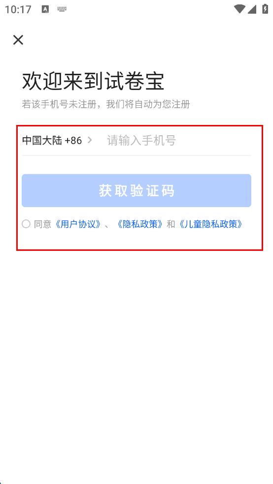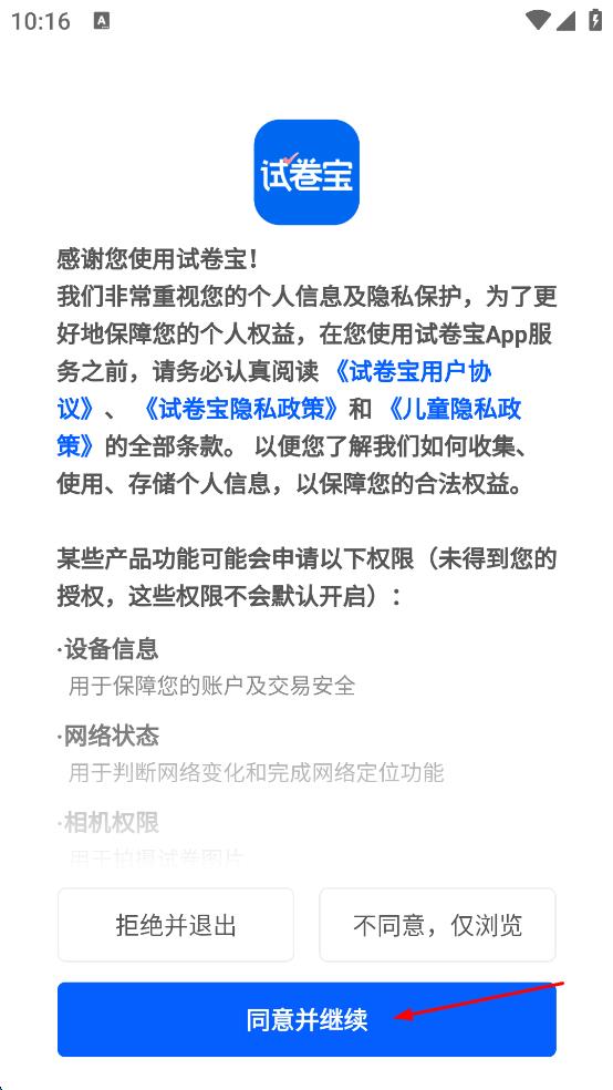 1、打開試卷寶APP,會彈出關(guān)于個人信息及隱私保護的提示,點擊“同意并繼續(xù)”按鈕。