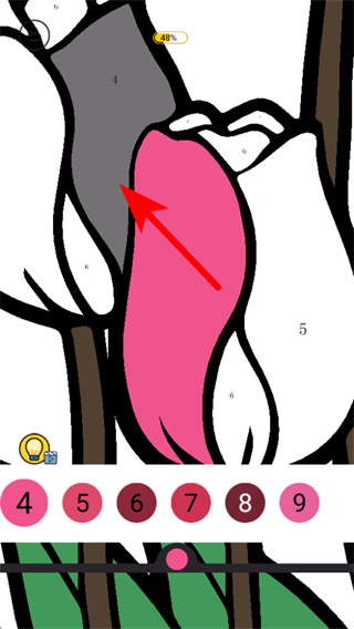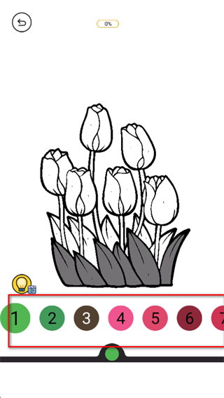 2、在涂色界面,點(diǎn)擊底部的數(shù)字顏色選項(xiàng)如數(shù)字1、2、3等,然后填充畫(huà)面中對(duì)應(yīng)數(shù)字的區(qū)域。
