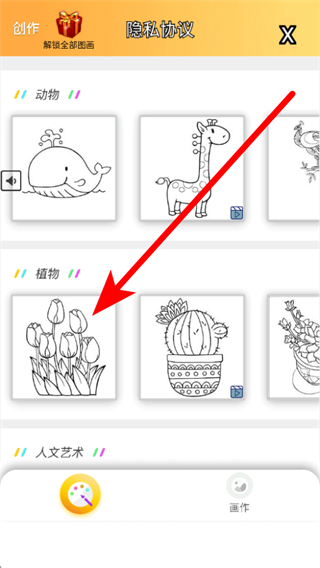 1、打開(kāi)小豬畫(huà)畫(huà)涂色APP,選擇喜歡的涂色圖案如植物類(lèi)的郁金香圖案,進(jìn)入涂色界面。
