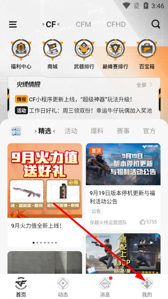 1、打開掌上穿越火線App進(jìn)入首頁,點(diǎn)擊底部導(dǎo)航欄中我的選項(xiàng)進(jìn)入個(gè)人界面。