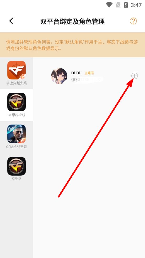 3、進(jìn)入雙平臺(tái)綁定及角色管理界面,點(diǎn)擊主賬號(hào)右側(cè)的+號(hào)。