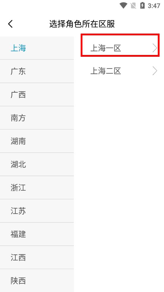 4、在選擇角色所在區(qū)服界面,選擇自己游戲角色所在的大區(qū),完成角色綁定。