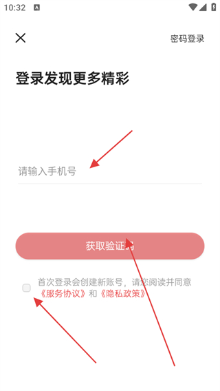 3、輸入手機(jī)號(hào)碼,勾選同意服務(wù)協(xié)議隱私政策,點(diǎn)擊獲取驗(yàn)證碼。
