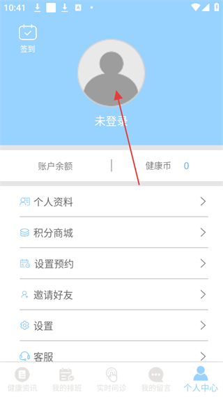 2、進(jìn)入個(gè)人中心頁(yè)面后,點(diǎn)擊顯示未登錄的頭像區(qū)域。
