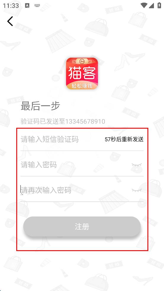 4、進入最后一步頁面,輸入短信驗證碼、密碼并再次輸入密碼,然后點擊“注冊”按鈕。
