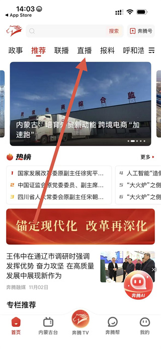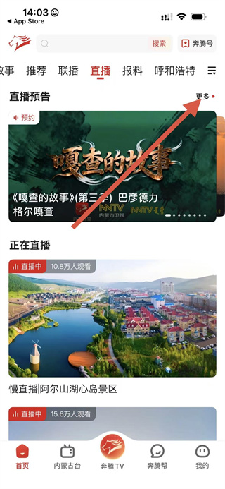 1、打開奔騰融媒App,點(diǎn)擊底部導(dǎo)航欄中的內(nèi)蒙古臺(tái)選項(xiàng)。