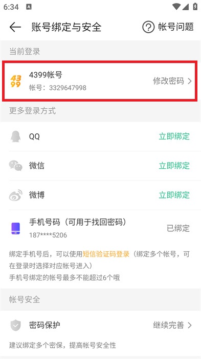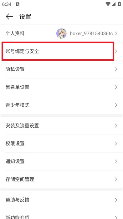3、在設(shè)置頁(yè)面,能夠看到【賬號(hào)綁定與安全】,進(jìn)入到其中去修改;