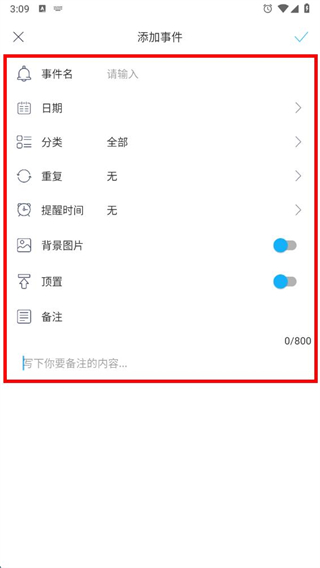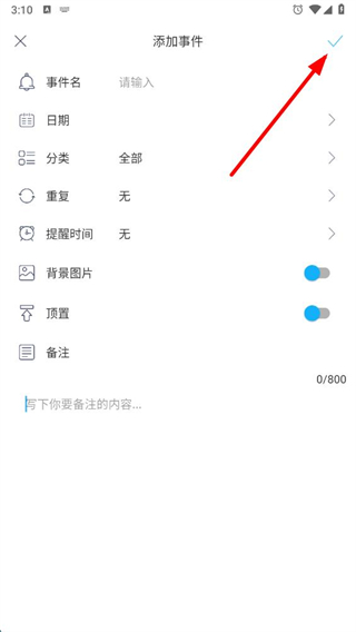 2、在添加事件頁(yè)面,依次輸入事件名,選擇日期、分類(lèi),設(shè)置重復(fù)周期和提醒時(shí)間,還能按需開(kāi)啟背景圖片、頂置開(kāi)關(guān),以及填寫(xiě)備注信息。