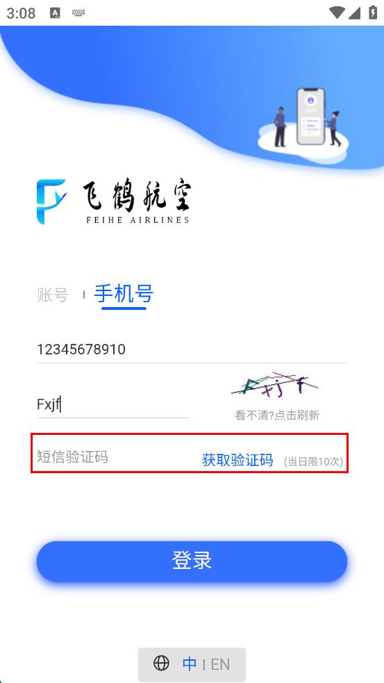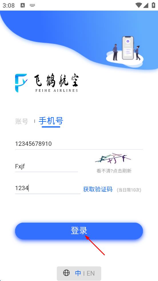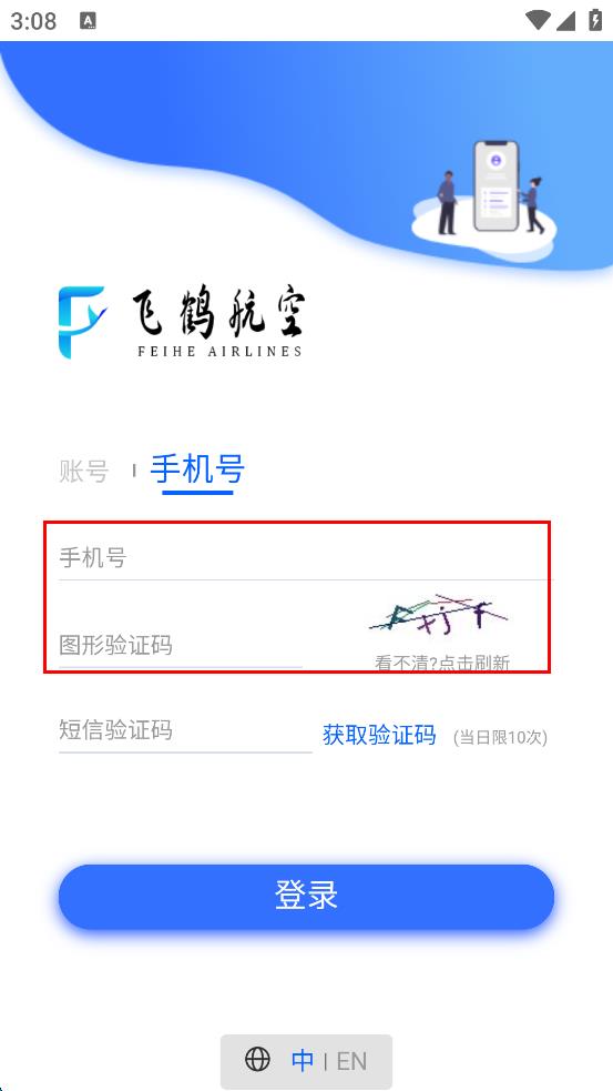 1、打開飛鶴航空軟件,在登錄界面找到“手機號”選項,點擊該選項切換到手機號登錄頁面。