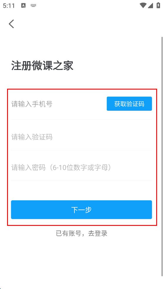 4、在注冊(cè)微課之家頁(yè)面輸入手機(jī)號(hào),點(diǎn)擊獲取驗(yàn)證碼,輸入驗(yàn)證碼,設(shè)置符合要求的密碼,點(diǎn)擊“下一步”,完成注冊(cè)操作。