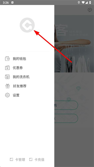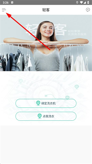 1、打開輕客洗衣app,點擊左上角的三條橫線圖標,打開側(cè)邊菜單欄。