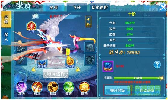 坐騎最高階級為十階,每一階級形狀都不同,階級越高屬性越高,進階需要消耗一定的坐騎進階丹,進階至四階后,祝福值每天凌晨五點會清零,祝福值越高進階幾率越高。