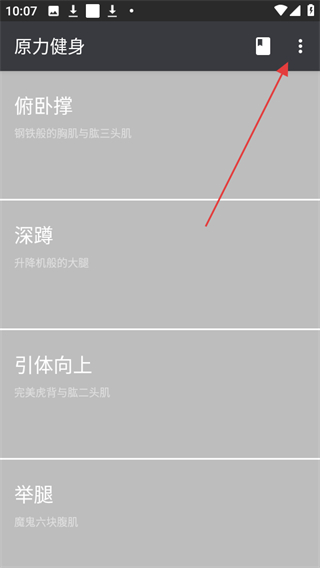 1、打開(kāi)原力囚徒健身app,在首頁(yè)點(diǎn)擊右上角的三點(diǎn)圖標(biāo)。