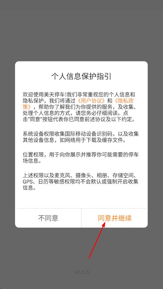 1、打開美天停車軟件,彈出個人信息保護指引彈窗,仔細(xì)閱讀內(nèi)容后,點擊“同意并繼續(xù)”按鈕,進入軟件主界面。