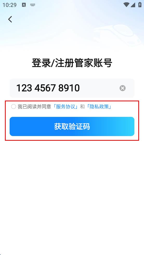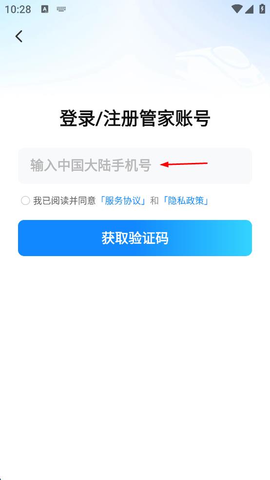 3、進入登錄/注冊管家賬號頁面,在對應的輸入框中輸入自己的中國大陸手機號。
