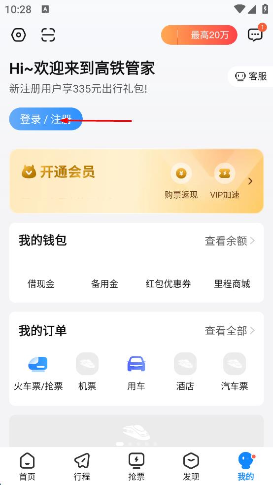 2、在“我的”頁面,找到上方的“登錄/注冊”按鈕,點擊該按鈕。