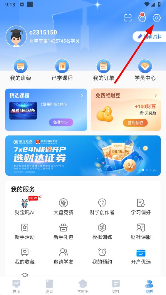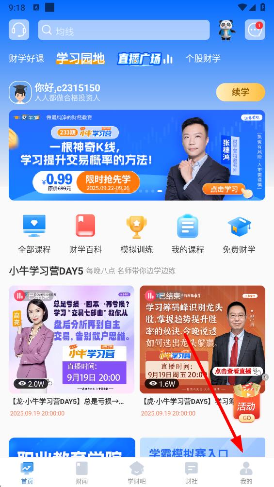 1、打開(kāi)財(cái)學(xué)堂app,點(diǎn)擊底部導(dǎo)航欄最右側(cè)的我的選項(xiàng),進(jìn)入個(gè)人相關(guān)界面。