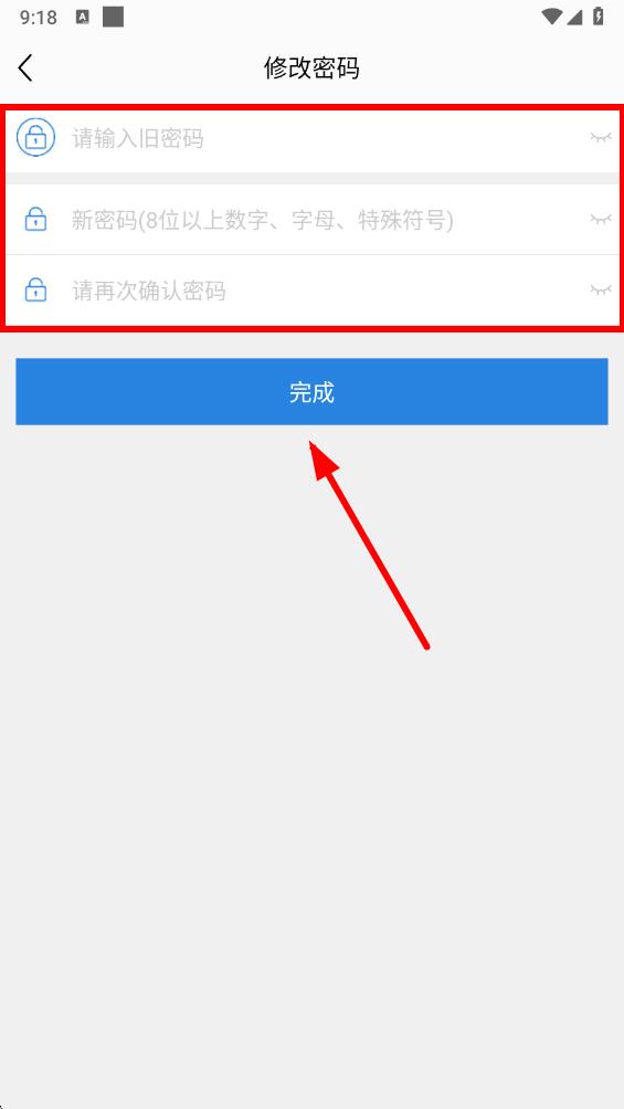 5、在頁(yè)面依次輸入舊密碼、新密碼并再次確認(rèn)新密碼,輸入完成后點(diǎn)擊完成按鈕,即可完成密碼修改操作。