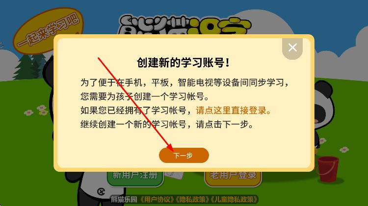 2、在彈出的創(chuàng)建新的學(xué)習(xí)賬號提示框中,點擊下一步。