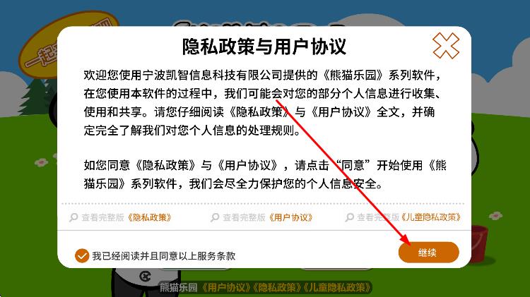 3、在隱私政策與用戶協(xié)議界面,勾選同意條款后,點擊繼續(xù)。