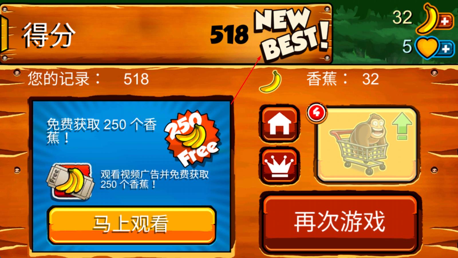 3、當(dāng)在跑酷中持續(xù)收集香蕉、靈活使用道具避開所有障礙,成功突破當(dāng)前關(guān)卡,即可解鎖新場(chǎng)景,用隱藏關(guān)卡獲得的裝飾裝扮小屋與金剛,開啟新挑戰(zhàn)。