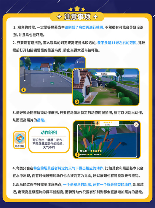 1、在拍鳥的過程中有多種不同的注意事項需要玩家留意,以下是注意事項的總結(jié)圖片,玩家可以詳細了解;