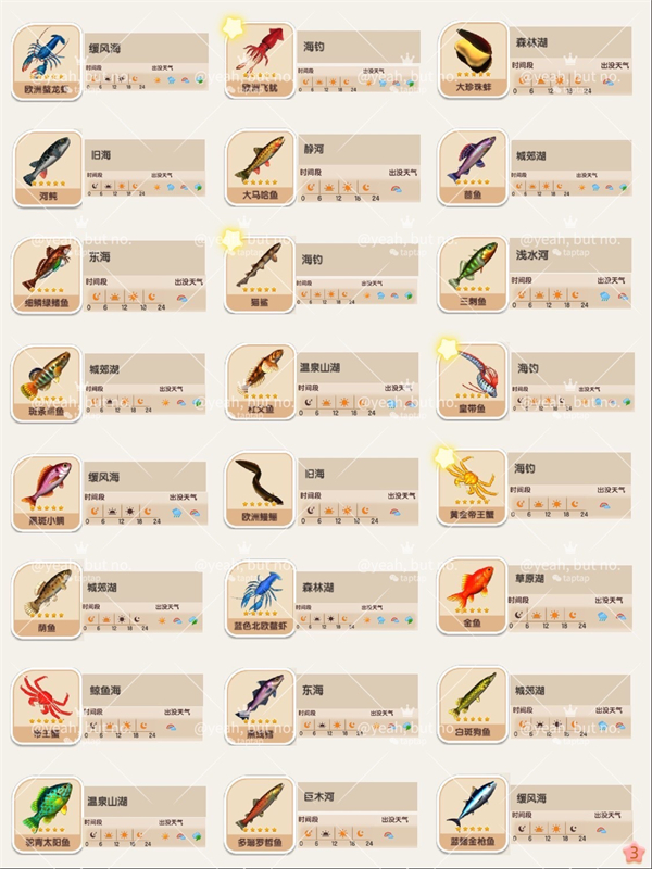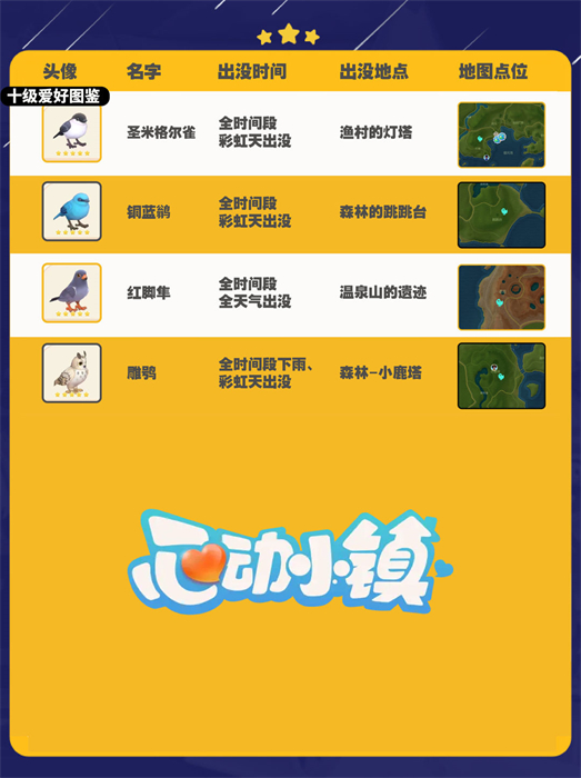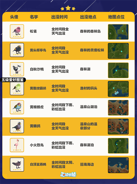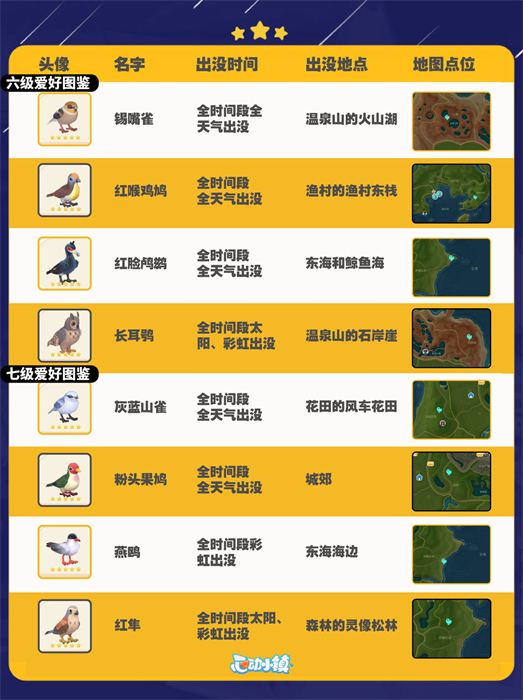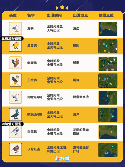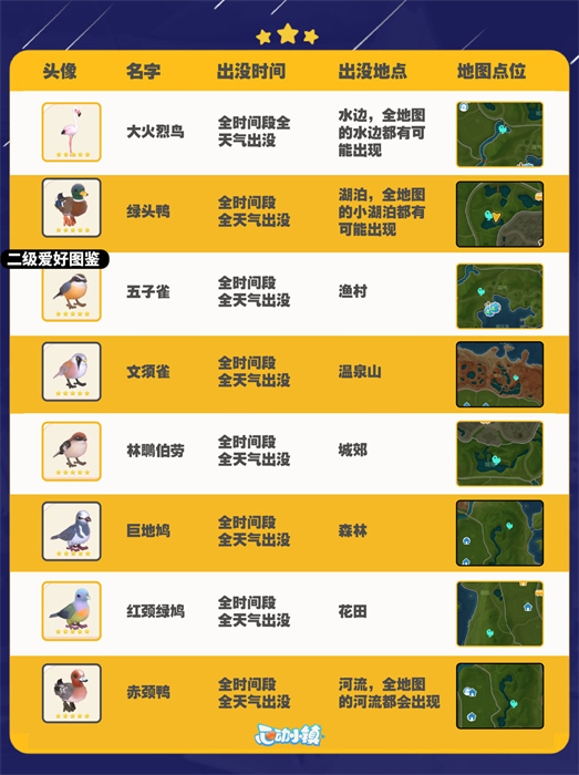 2、不同的鳥類將會有著不同的出沒時間以及出沒地點,且這些鳥類被拍到的價值也不同,故小編總結(jié)了以下所有不同等級鳥類的出沒地點以及時間,可供玩家們更好的進行拍鳥。