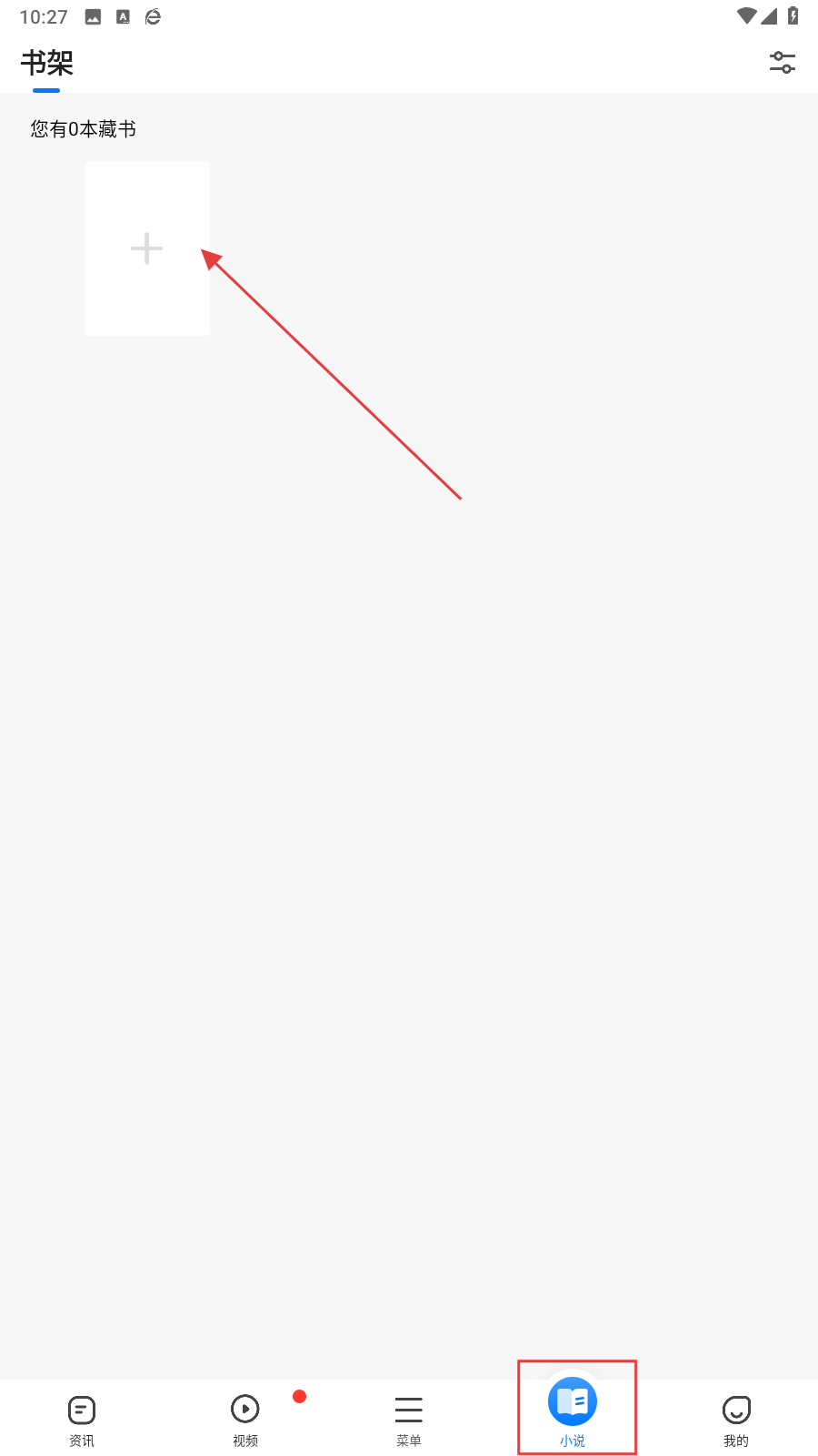 1、打開360瀏覽器時,將下方導(dǎo)航欄切換至小說的界面,再點擊+號的圖標(biāo)。