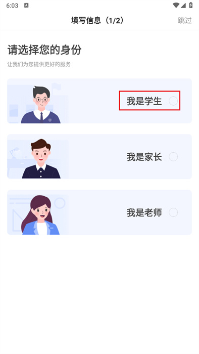 1、進(jìn)入到應(yīng)用之中后,用戶可以根據(jù)自己的身份來進(jìn)行選項的選擇,小編將以【我是學(xué)生】按鈕來進(jìn)行演示;