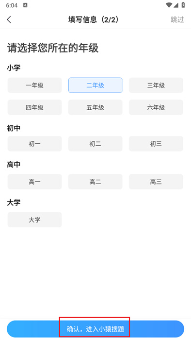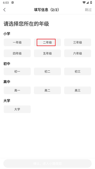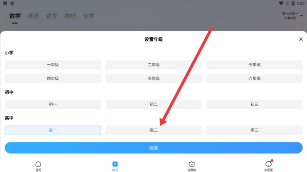 3、在設(shè)置年級界面,選擇高中板塊下的高二選項,點(diǎn)擊下方完成按鈕,完成年級重新設(shè)置,更新學(xué)習(xí)內(nèi)容適配。