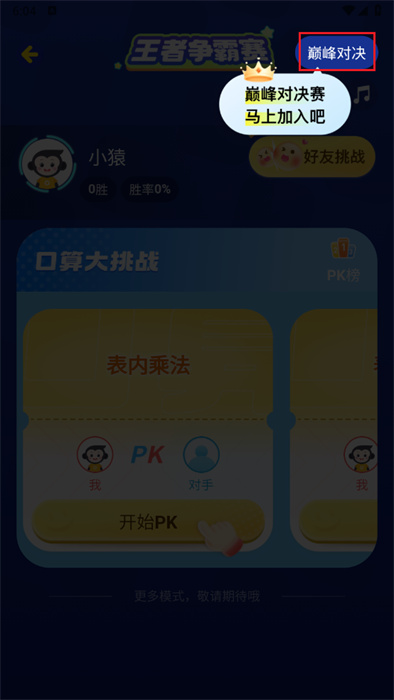5、進(jìn)入后點(diǎn)擊【巔峰對決】來進(jìn)行比賽。