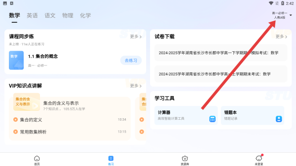 2、在練習(xí)頁面右上角,點(diǎn)擊個人設(shè)置區(qū)域的年級選擇入口,進(jìn)入設(shè)置年級界面,準(zhǔn)備調(diào)整學(xué)習(xí)年級。