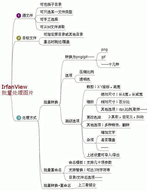 主要功能有:改變格式、改變大?。o論是絕對大小、百分比、縮放、裁剪)、改變方向、做特效、加文字、改文件名(極其強大,模板可調(diào)用幾十個參數(shù),還能同時做3組替換)...等等
