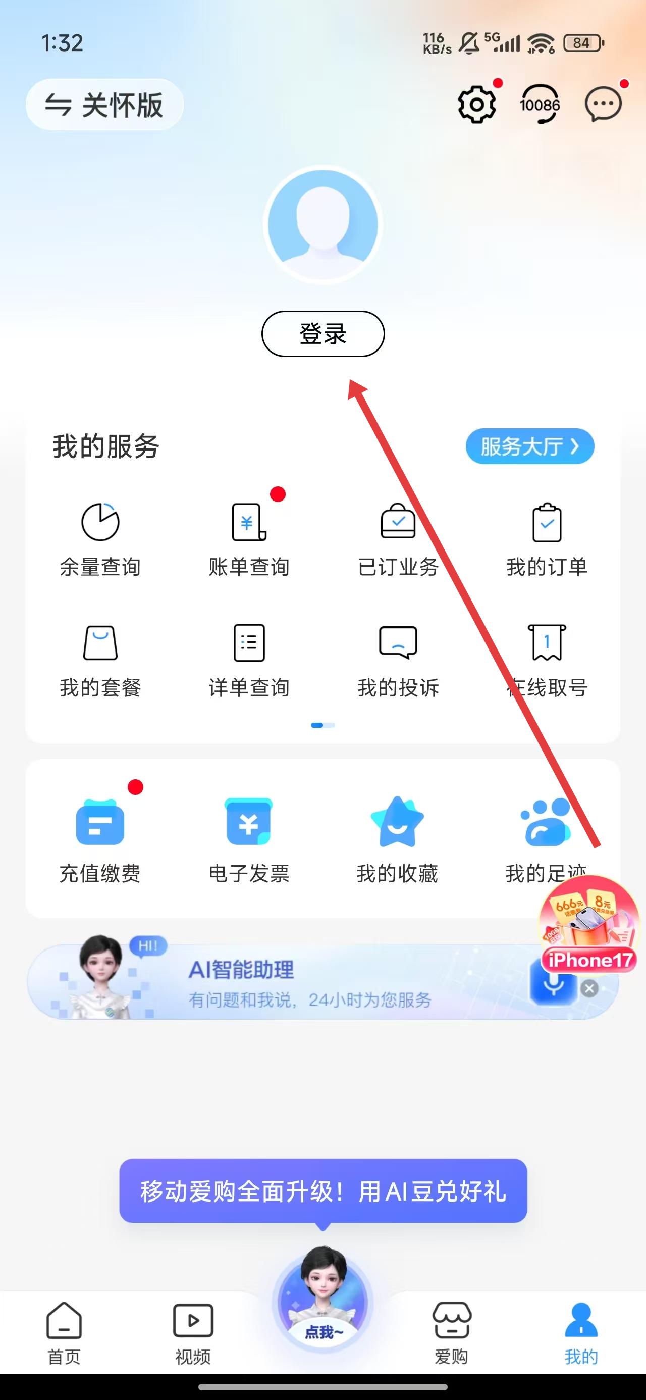 1、在進(jìn)入到中國(guó)移動(dòng)App后,可以在我的頁(yè)面中,點(diǎn)擊登錄按鈕后進(jìn)行操作。
