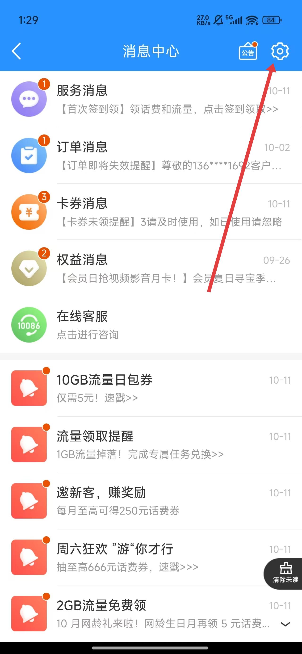 3、在進(jìn)入到消息中心頁(yè)面后,若不想看到活動(dòng)消息,可以點(diǎn)擊右上方齒輪圖標(biāo)進(jìn)行設(shè)置。