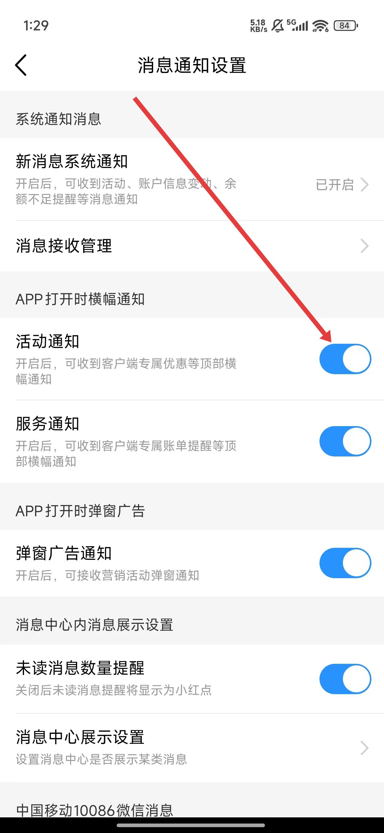 4、進(jìn)入到消息通知設(shè)置頁(yè)面里,可以點(diǎn)擊活動(dòng)通知右側(cè)的開(kāi)關(guān)按鈕后,關(guān)閉活動(dòng)通知功能。