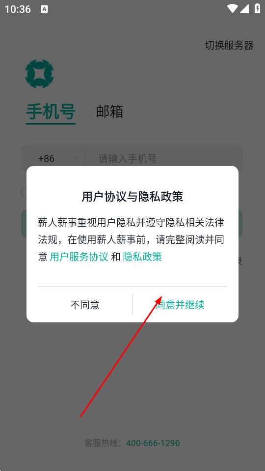 1、打開(kāi)薪人薪事APP,在彈出的用戶協(xié)議與隱私政策提示框中,點(diǎn)擊同意并繼續(xù)。