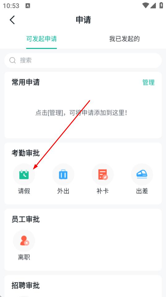 3、在申請(qǐng)頁(yè)面,點(diǎn)擊考勤審批板塊下的請(qǐng)假選項(xiàng)。