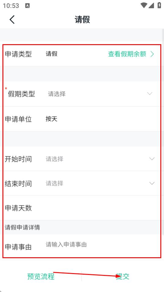 4、在請(qǐng)假頁(yè)面,填寫(xiě)信息,點(diǎn)擊提交,即可完成請(qǐng)假申請(qǐng)。