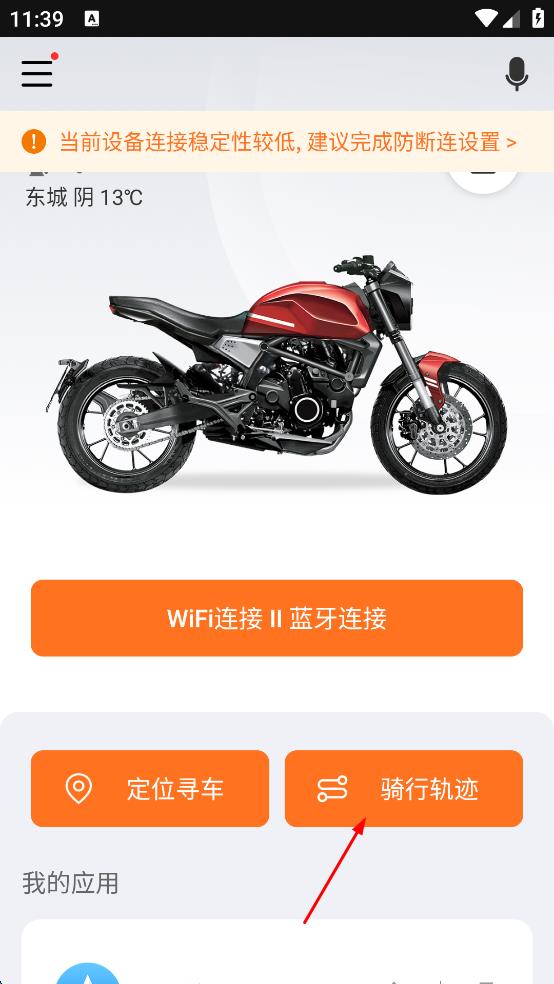 3、連接成功后,返回軟件主界面,點(diǎn)擊“騎行軌跡”選項(xiàng),進(jìn)入騎行軌跡頁面。