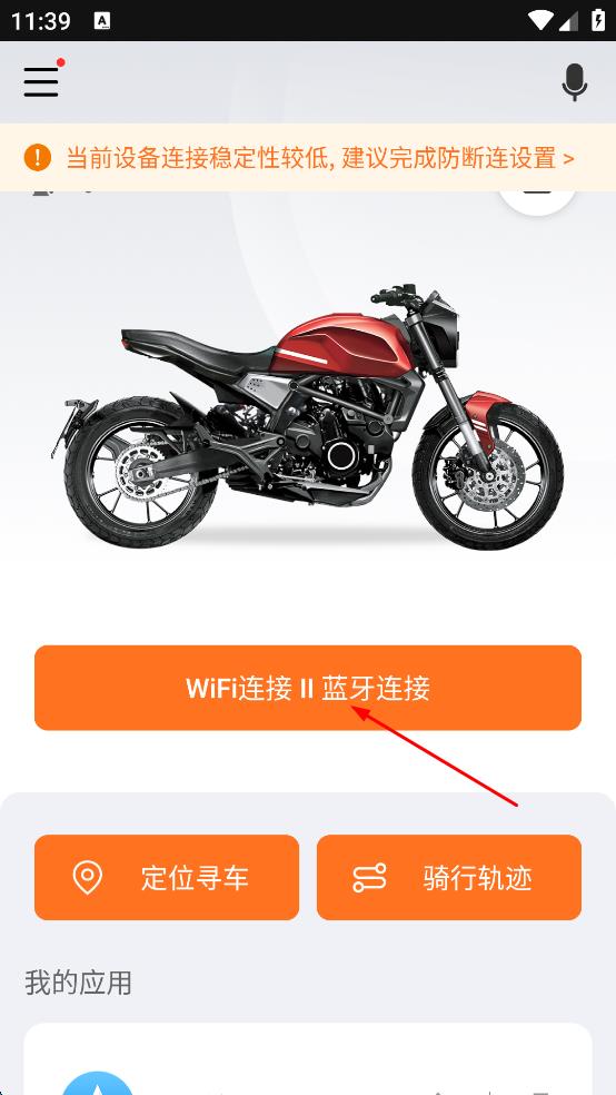 1、打開摩托車管理軟件,點(diǎn)擊“WiFi連接||藍(lán)牙連接”按鈕,進(jìn)入掃碼連接界面。