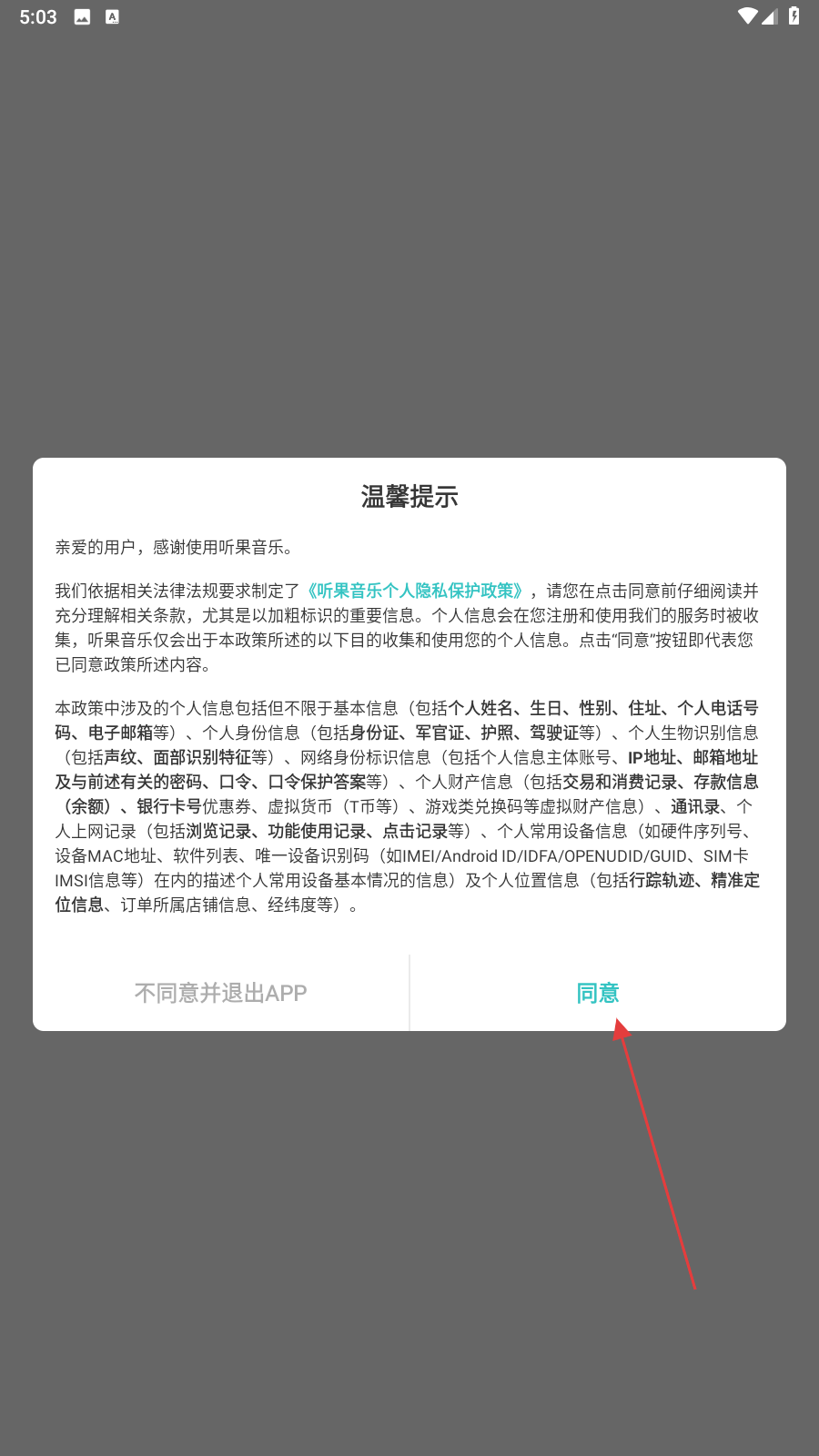 1、打開聽果音樂APP,進入時會彈出溫馨提示,點擊同意的按鈕。