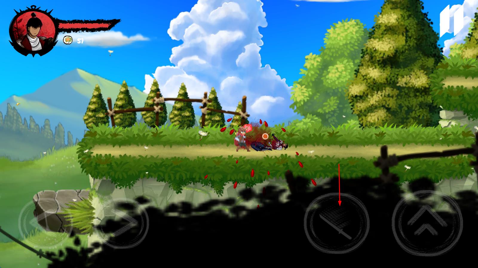 3、遇到敵人時(shí),點(diǎn)擊右下角攻擊按鍵,讓武士揮刀戰(zhàn)斗,擊敗阻攔的敵人,繼續(xù)推進(jìn)冒險(xiǎn)進(jìn)程。