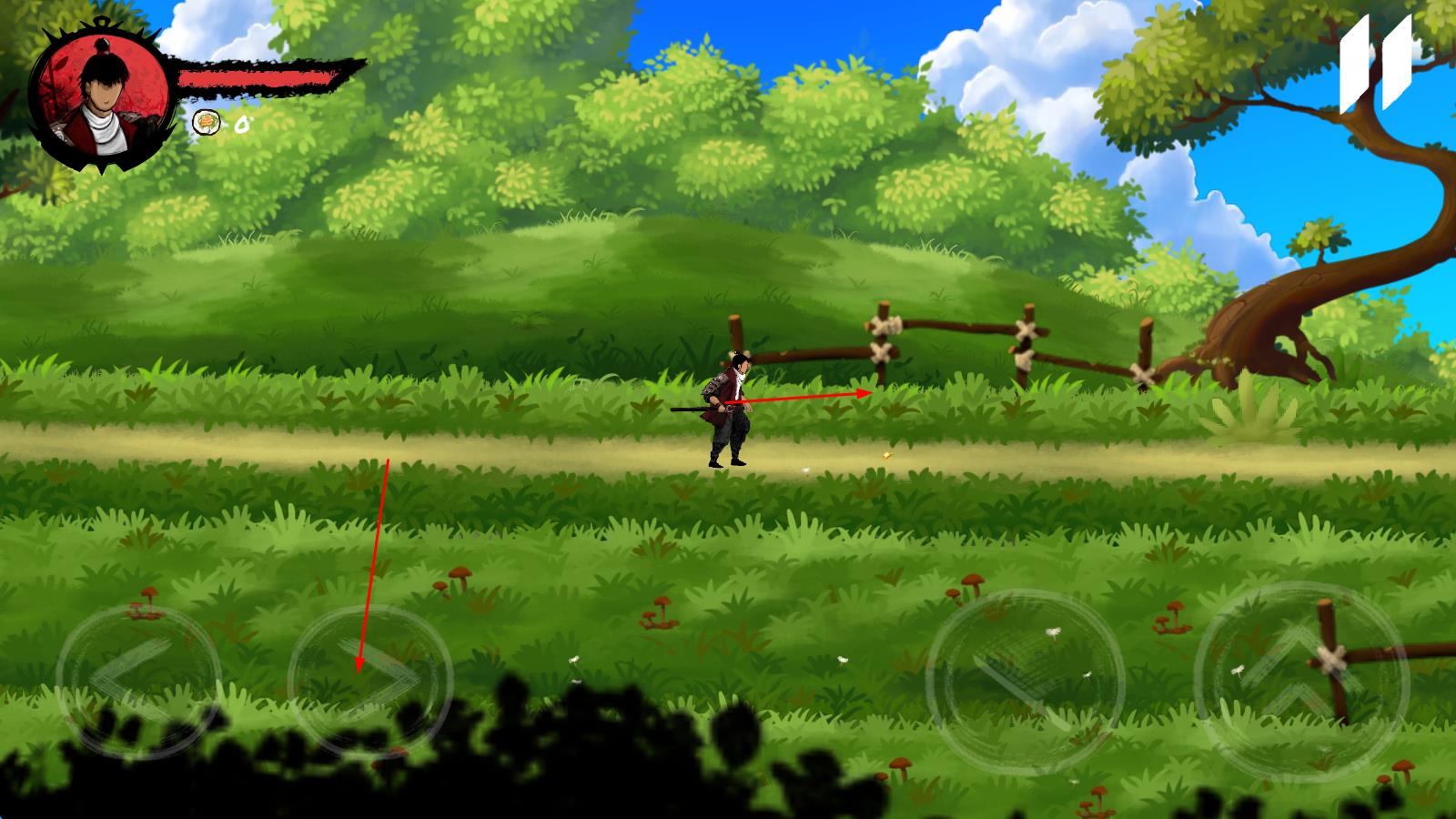 2、在草地場景,通過左下角方向按鍵,操控武士向右移動(dòng),探索沿途的環(huán)境與可能出現(xiàn)的狀況。