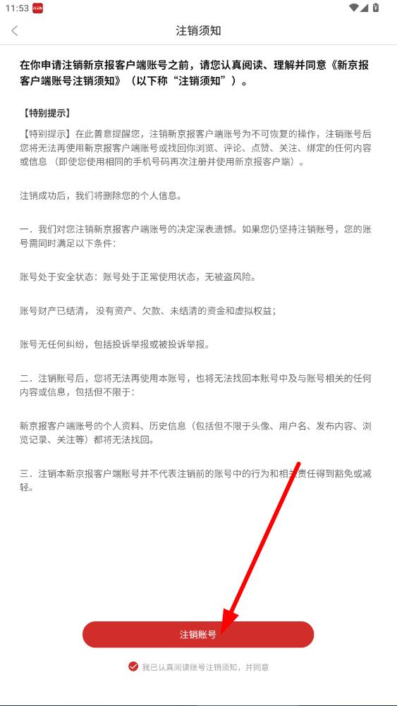 4、仔細閱讀注銷須知后,勾選同意相關(guān)條款,點擊注銷賬號,按照提示完成后續(xù)操作即可注銷賬號。
