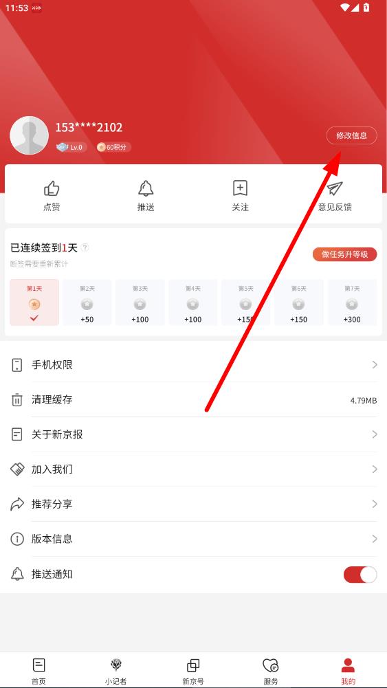 2、進入我的頁面,點擊頭像右側(cè)的修改信息。